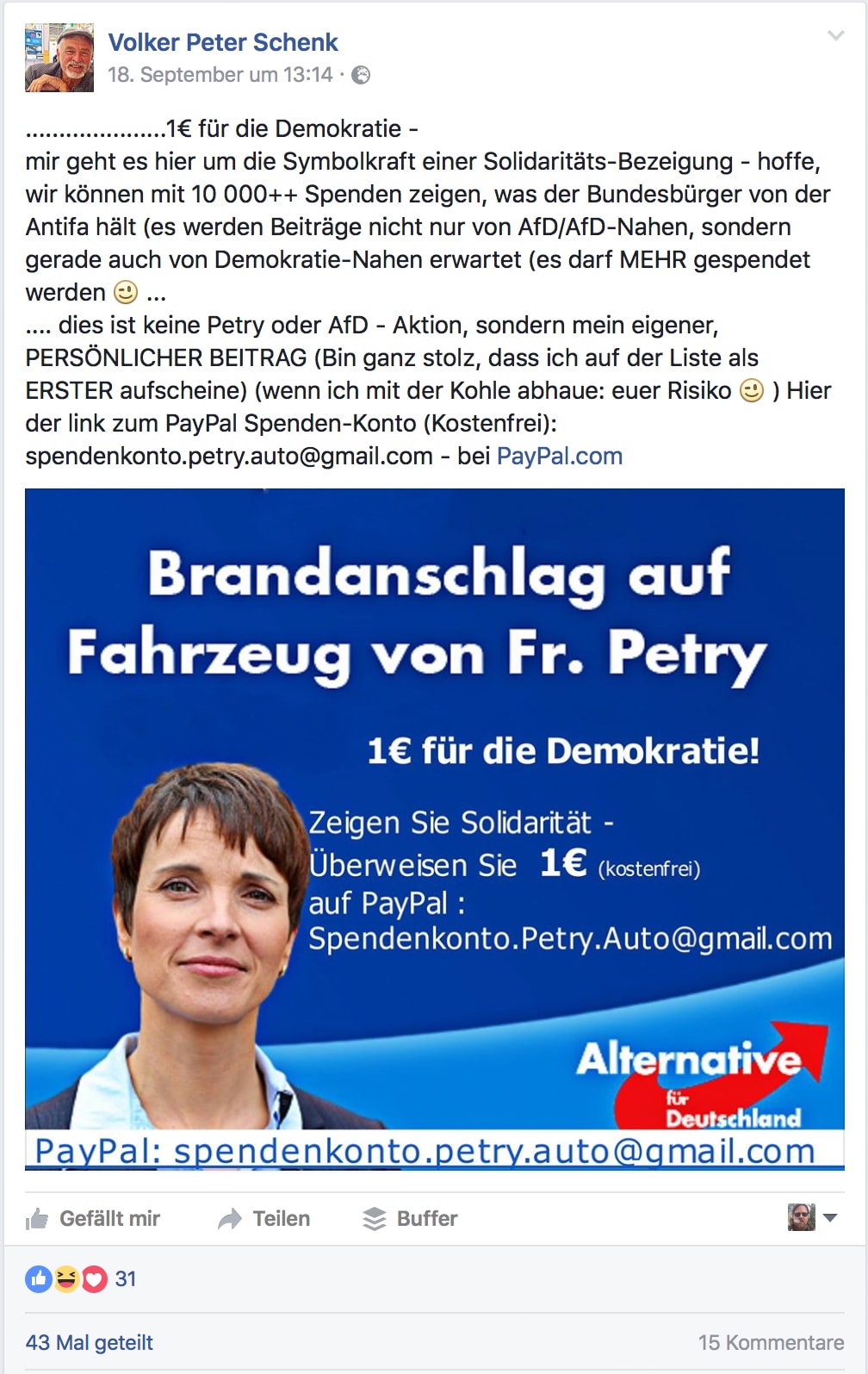 Aber irgendwie beruhigt es mich doch, wenn immer wieder mal ein AfDer deutlich macht, dass er eben nicht wirklich viel von Demokratie hält. Zum Beispiel wenn Spenden gesammelt werden sollen für das abgebrannte Auto der großen Vorsitzenden Frau Kepetry: