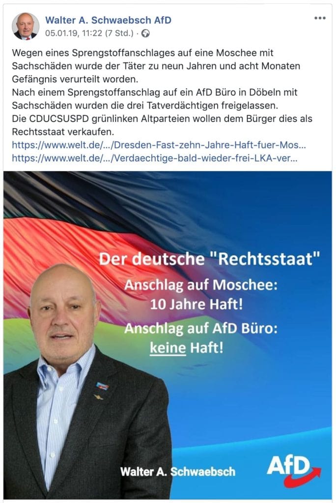 Konkret geht es um die Explosion vor einem AfD-Büro in Döbeln. Es wird vermutet, dass es sich hier um eine Straftat mit politischer Motivation handelt. Worüber man nicht diskutieren muss: Straftaten müssen aufgeklärt werden und am Ende eines rechtsstaatlichen Verfahrens steht dann hoffentlich die Verurteilung des oder der Täter. Aber so lange möchte der Herr Walter Schwäbsch von der AfD nicht warten, er bastelt lieber jetzt schon mal ein äußerst dummes Bildchen: