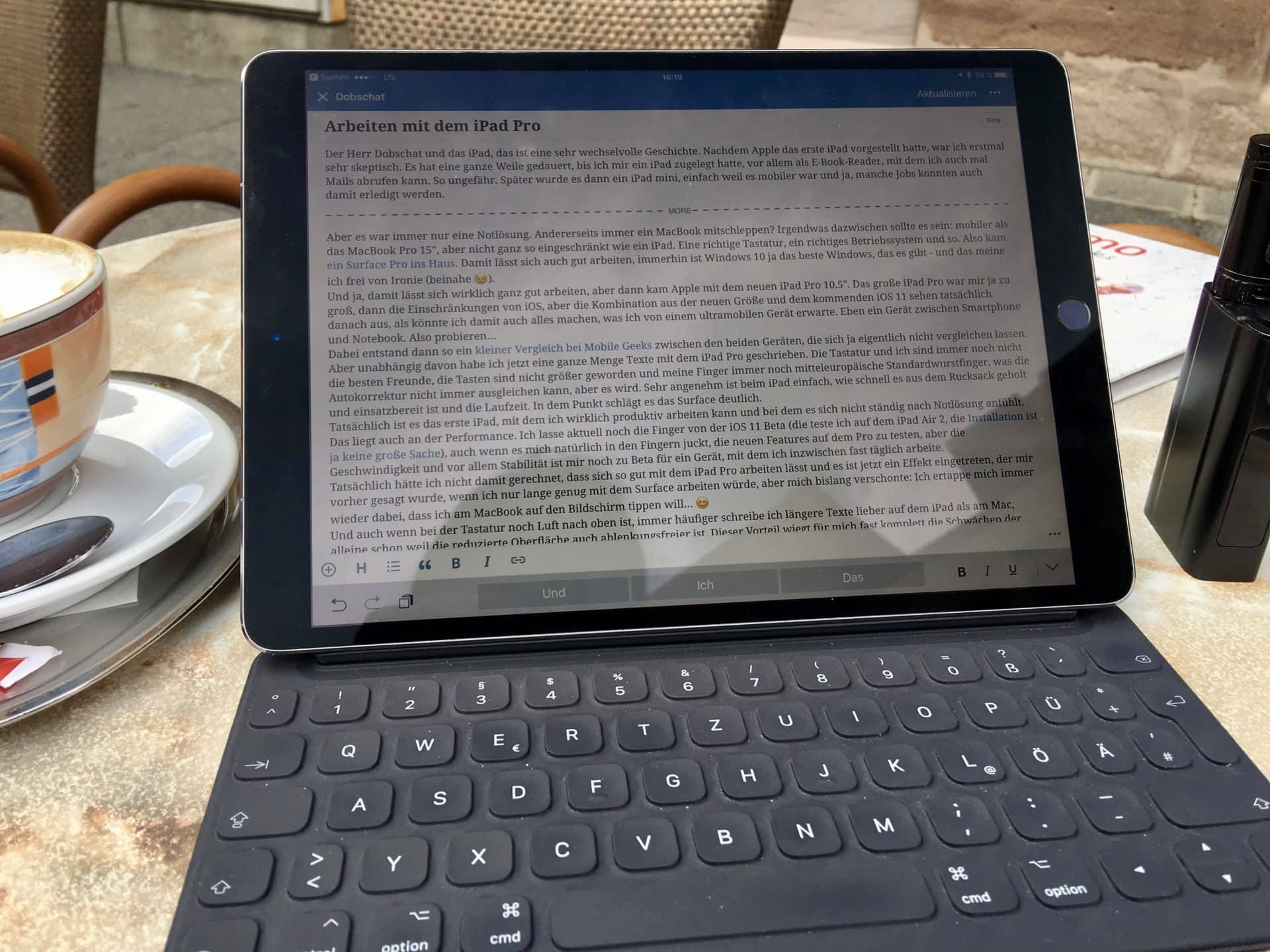 Tatsächlich ist es das erste iPad, mit dem ich wirklich produktiv arbeiten kann und bei dem es sich nicht ständig nach Notlösung anfühlt. Das liegt auch an der Performance. Ich lasse aktuell noch die Finger von der iOS 11 Beta (die teste ich auf dem iPad Air 2, die Installation ist ja keine große Sache), auch wenn es mich natürlich in den Fingern juckt, die neuen Features auf dem Pro zu testen, aber die Geschwindigkeit und vor allem Stabilität ist mir noch zu Beta für ein Gerät, mit dem ich inzwischen fast täglich arbeite.