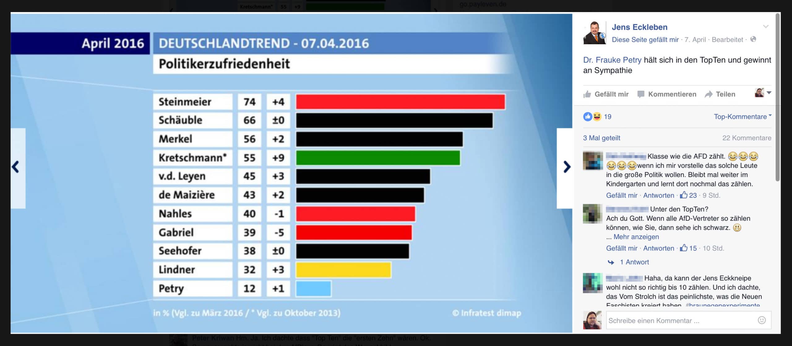Komisch, dass er das nicht erwähnt hat, schließlich hat seine große Vorsitzende hier die Spitzenposition inne. Und eine beeindruckende Leistung muss man auch schon mal loben: Frauke Petry schaffte es zur höchsten Unzufriedenheit mit ihrer politischen Arbeit, obwohl sie so gut wie gar nicht politisch arbeitet. Wenn das keine Leistung ist, so was schafft nicht jeder!
