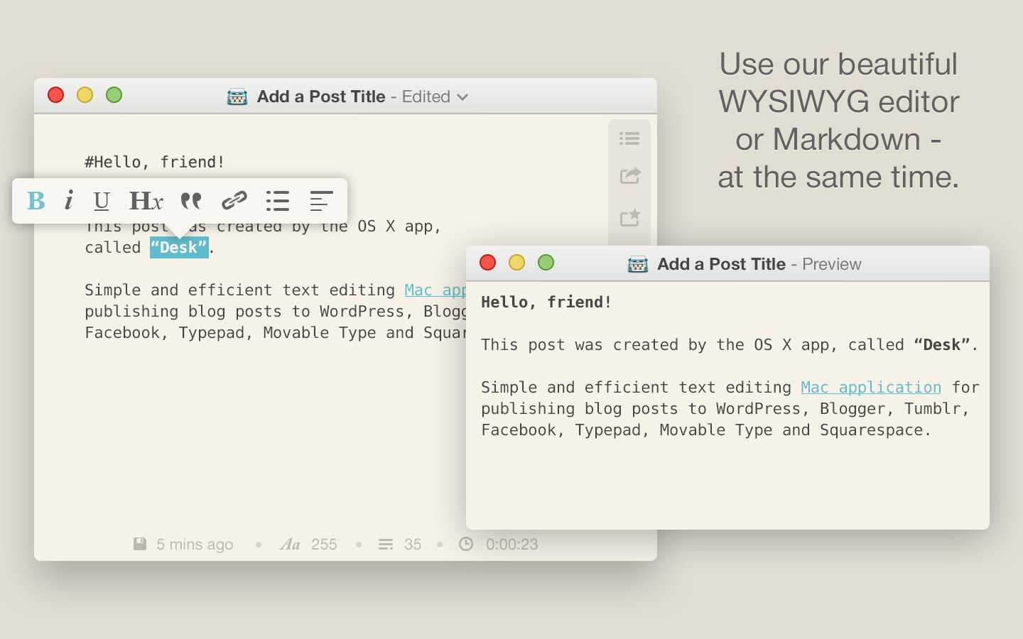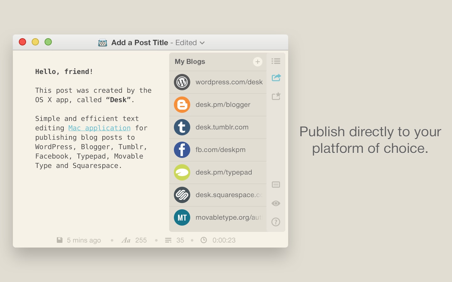Vorne weg: Desk gibt es für Mac OS X, wer also eine Software für Windows oder Linux sucht, der sucht bitte weiter ;) Zu haben ist Desk für 26,99 Euro im Mac App Store. Das mag spontan etwas teuer erscheinen, für eine Software, mit der man ein Blog füttert, dessen Software kostenlos ist. Kann man so sehen, aber wer viel und häufig bloggt und das womöglich noch in verschiedenen Weblogs, der wird ganz froh darum sein, eine App zu haben, in der man sich ausschließlich auf das Schreiben konzentrieren kann. Jedes Weblog hat ja unterschiedliche PlugIns und Zeug, was man vor dem Posten noch beachten muss. Mit Desk kann man einfach erstmal den Text schreiben, ohne Ablenkung und am Ende packt man ihn ins Wordpress-Backend und kümmert sich dort um den Rest – oder man veröffentlicht direkt aus Desk raus. Übrigens wird nicht nur Wordpress unterstützt, sondern auch Tumblr, Blogger, Typepad, Movable Type, Squarespace und Facebook – „and more to come soon“.