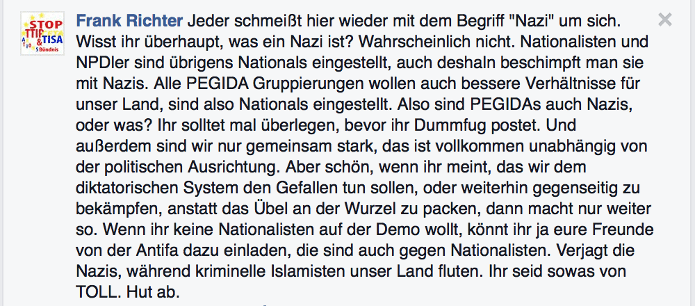 Übrigens wurde die auf Facebook groß angekündigte Distanzierung von der NPD und anderen Rechtsextremen auf der SaarGIDA-Kundgebung vor der Europagalerie genau gar nicht umgesetzt: NPD-Größen und bekannte Neonazi-Schläger waren anwesend und man ging eben nicht auf Distanz zu ihnen. War nun nicht überraschend. Wobei die Diskussionen zu der „Distanzierung“ auf Facebook durchaus amüsante Beiträge hatte: