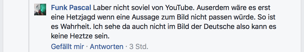 Nur zur Erinnerung: Es steht unter dem Beitrag, dass es sich um ein „Beispielfoto“ von YouTube handelt. Das hindert aber so manchen medieninkompetenten Mitbürger nicht daran, sich auf dieses Bild zu berufen und davon auszugehen, dass die Verdächtigen eben keine „Deutschen“ gewesen sein könnten. Mal abgesehen davon, dass die Frage ob jemand Deutscher ist oder nicht, keine Frage der Hautfarbe, sondern eine Frage der Staatsangehörigkeit ist, beweist auch dieser „besorgte Bürger“ nur seine eigene Inkompetenz im Umgang mit den Medien.