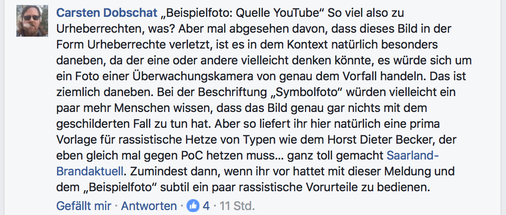 Die Betreiber der Seite „Saarland-Brandaktuell“ scheint es aber nicht zu stören, dass sie mit der Wahl dieses „Beispielfotos“ rassistische Vorurteile bedienen und entsprechende Kommentare provozieren (von Urheberrechten wollen wir mal nicht anfangen, das ist tatsächlich eine ganz andere Nummer, wenn man sich seine Symbolbilder einfach mal bei YouTube zieht), was ihnen spätestens nach meinem Kommentar gestern Abend bekannt gewesen sein muss.