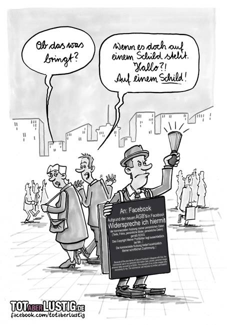 Tausende haben widersprochen: Den Änderungen der Facebook-AGB. Das haben sie aber nicht getan, indem sie Facebook einen Brief oder eine Mail geschrieben hätten, nein, sie haben einen Widerspruch in grafischer Form geteilt. Das war nervig und nutzlos – und überhaupt: Wenn ein solcher Widerspruch denn nun wirklich irgendwas bringen würde, dann gäbe es doch andere Dinge, denen man eher widersprechen sollte…