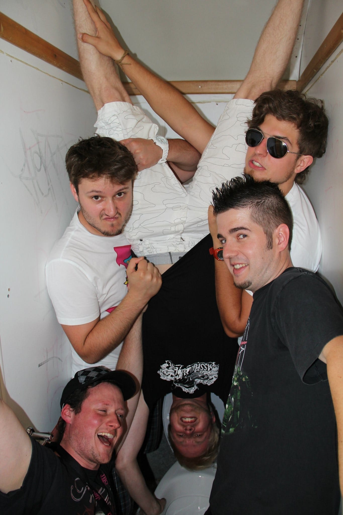 Diese fünf netten Herren hier rechts im Bild sind Bernd, Sascha, Nico und Flo (v.l.), die versuchen Daniel (Mitte) nicht ins Klo fallen zu lassen. Zusammen sind sie „An Assfull Of Love“, diese talentierte junge Glam-Punk-Band aus Saarbrücken, die ich gelegentlich gerne mal erwähne ;)