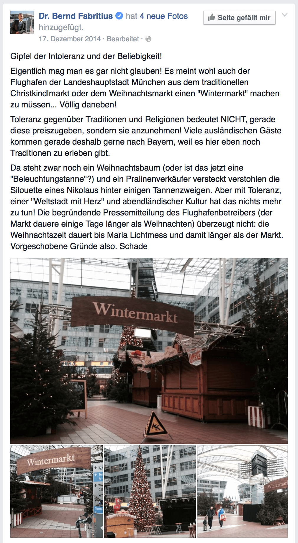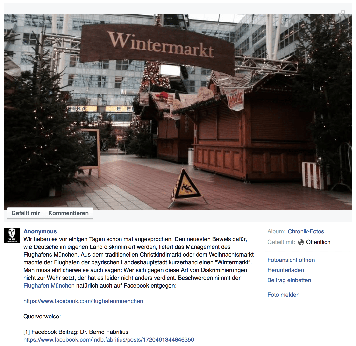 Na eben nicht, das ist ja gerade das Problem. Am Ende bleiben dann doch immer nur Falschmeldungen oder wie in diesem Fall alter Scheiß, der gar nichts mit Muslimen oder einer angeblichen Abschaffung der abendländischen Kultur zu tun hat. Es sollte sich inzwischen schon herumgesprochen haben, dass die Facebook-Seite „Anonymous“ (unter der Adresse https://www.facebook.com/Anonymous.Kollektiv ) nichts mit Anonymous zu tun hat, sondern eine reine LinkDreckschleuder für hetzerische Lügen, rechte Kackscheiße, Verschwörungstheorien und anderem Zeug ist, wie es „besorgte Bürger“ so lieben. Und da geht nun also der Betreiber dieser Seite (welches Arschloch auch immer das sein mag) her, schnappt sich einen Beitrag, mit dem sich ein CSU-Abgeordneter schon letztes Jahr als total neben der Spur geoutet hat und tut nun so, als wäre die Umbenennung des Weihnachtsmarktes des Münchner Flughafens in Wintermarkt erst dieses Jahr erfolgt. Tja, dummerweise ist dem nicht so. Der Markt wurde auch nicht letztes Jahr umgetauft. Nein, bereits 2006 gab es den neuen Namen. Und zwar nicht aus Rücksicht vor irgendjemands religiösen Gefühlen oder so, sondern ganz einfach, weil der Markt da bis in den Januar ging. Klassische Weihnachtsmärkte gehen vom Beginn der Adventszeit bis Heiligabend oder einen der beiden Weihnachtsfeiertage, aber eben nicht bis in den Januar. Daher der damals neue Name, der nun eben beibehalten wurde.