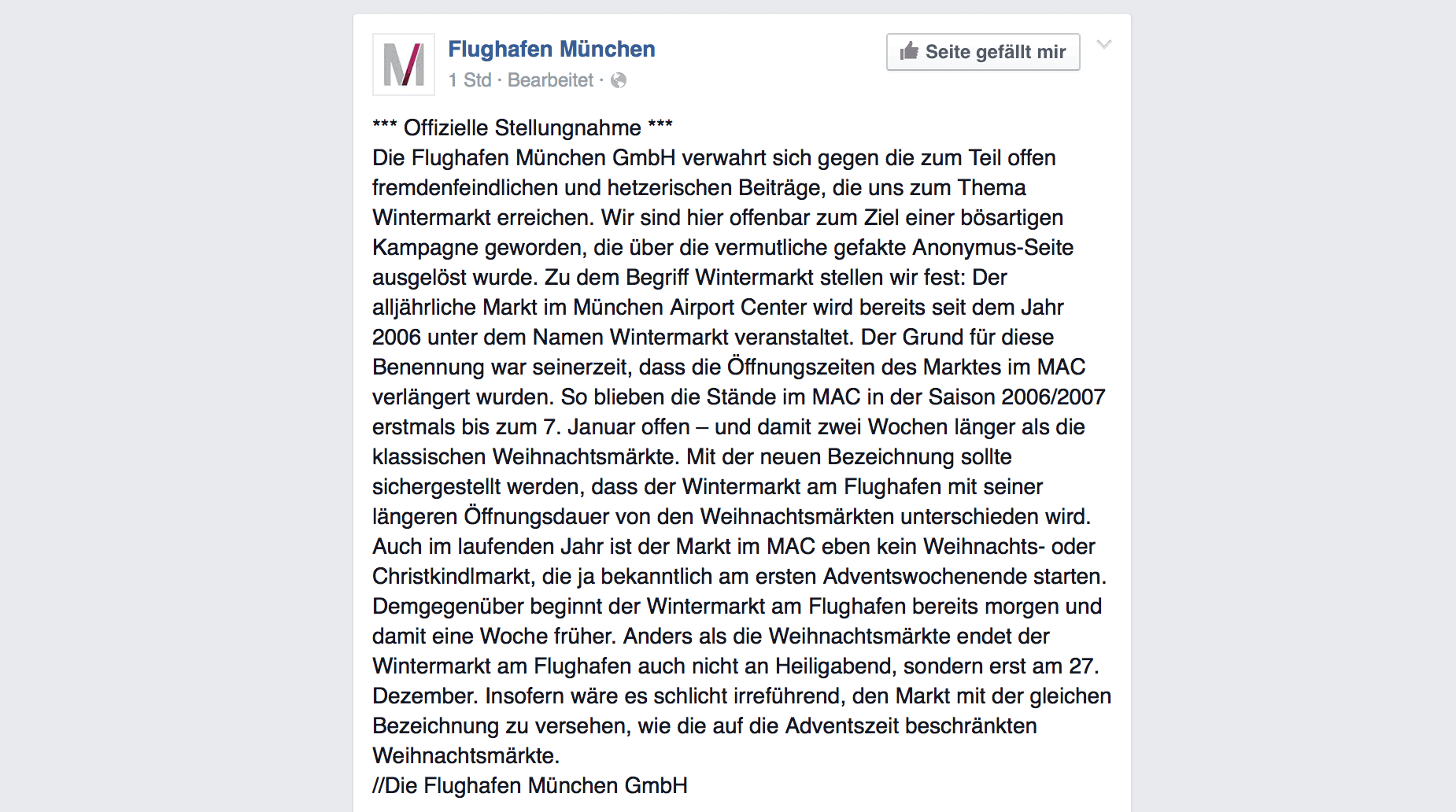 Die Flughafen München GmbH verwahrt sich gegen die zum Teil offen fremdenfeindlichen und hetzerischen Beiträge, die uns zum Thema Wintermarkt erreichen. Wir sind hier offenbar zum Ziel einer bösartigen Kampagne geworden, die über die vermutliche gefakte Anonymus-Seite ausgelöst wurde. Zu dem Begriff Wintermarkt stellen wir fest: Der alljährliche Markt im München Airport Center wird bereits seit dem Jahr 2006 unter dem Namen Wintermarkt veranstaltet. Der Grund für diese Benennung war seinerzeit, dass die Öffnungszeiten des Marktes im MAC verlängert wurden. So blieben die Stände im MAC in der Saison 2006/2007 erstmals bis zum 7. Januar offen – und damit zwei Wochen länger als die klassischen Weihnachtsmärkte. Mit der neuen Bezeichnung sollte sichergestellt werden, dass der Wintermarkt am Flughafen mit seiner längeren Öffnungsdauer von den Weihnachtsmärkten unterschieden wird. Auch im laufenden Jahr ist der Markt im MAC eben kein Weihnachts- oder Christkindlmarkt, die ja bekanntlich am ersten Adventswochenende starten. Demgegenüber beginnt der Wintermarkt am Flughafen bereits morgen und damit eine Woche früher. Anders als die Weihnachtsmärkte endet der Wintermarkt am Flughafen auch nicht an Heiligabend, sondern erst am 27. Dezember. Insofern wäre es schlicht irreführend, den Markt mit der gleichen Bezeichnung zu versehen, wie die auf die Adventszeit beschränkten Weihnachtsmärkte.