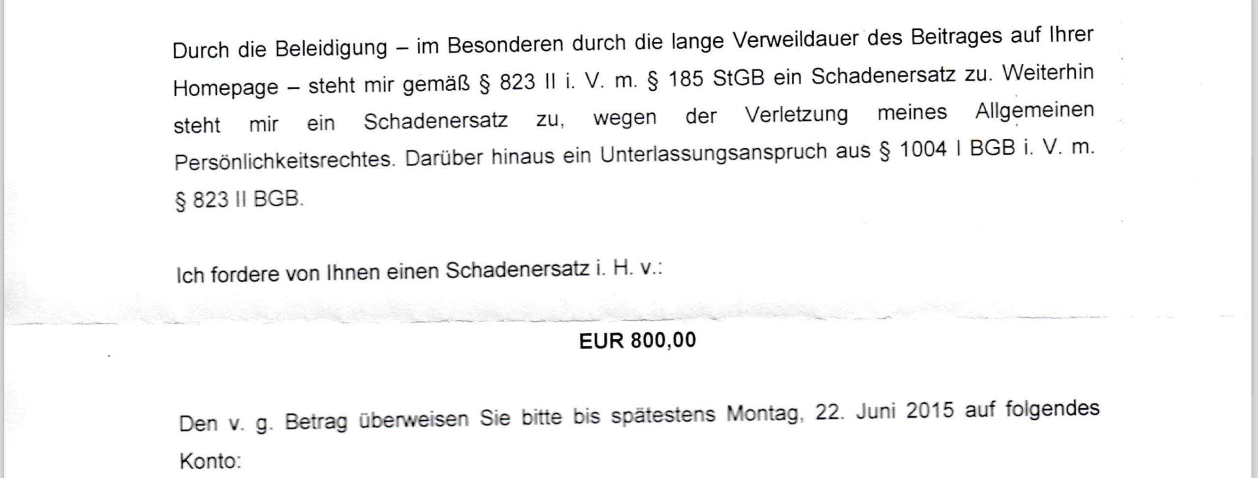 Irgendwann war die ganze Sache in Vergessenheit geraten: Einem Parteiausschluss aus der CDU kam der Mann durch Parteiaustritt zuvor und nach einer gewissen Welle durch bundesweite Medien (deren Artikel alle noch im Netz zu finden sind, aber dazu später mehr) verschwand Hans-Peter in der wohlverdienten Versenkung. Bis zum Juni diesen Jahres. Da bekam ich Post von diesem Herrn, in der er mir eine Strafanzeige ankündigte und mir mit einer Klage drohte, falls ich ihm nicht 800 Euro Schadenersatz überweisen würde.