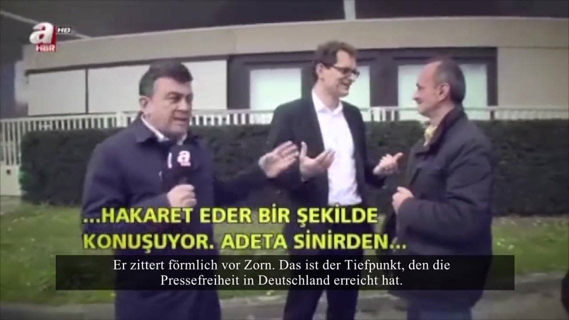 Wenn die ganze Geschichte nicht so traurig wäre, dann könnte man sich ja herrlich über den Reporter des türkischen Senders „A Haber“ amüsieren. Aber vielleicht ist es ja Satire, aber anscheinend ist es das wohl nicht. Da kommt also ein türkischer Reporter unangemeldet zum ZDF und will die Grenzen der Pressefreiheit in Deutschland testen. Untermalt von dramatischer Musik erklärt er dann, dass die Pressefreiheit in Deutschland wohl ziemlich am Ende wäre, schließlich will sich der Sicherheitsmensch am Tor nicht filmen lassen und ZDF-Sprecher Alexander Stock hat doch tatsächlich die Hände in den Hosentaschen!!!11elf!!