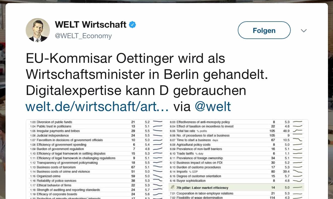 Sarkasmus auf dem Twitter-Kanal von WELT Wirtschaft? Leider nein, die meinen das tatsächlich und wirklich ernst, wenn sie erzählen, dass Günther Oettinger mit seiner „Expertise für Digitales und Energiepolitik“ eine Idealbesetzung für das Bundeswirtschaftsministerium wäre…