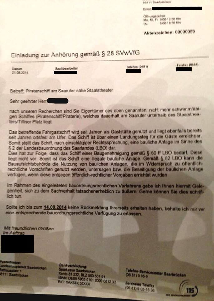 Wie auch immer, nachdem die Stadt erst einmal den Mietvertrag für den Biergarten vor dem Schiff gekündigt hat, entdeckte die Verwaltung jetzt plötzlich, dass das Schiff – wohlgemerkt seit 10 Jahren als Kneipe betrieben – eigentlich eine Baugenehmigung bräuchte, aber keine hätte. Ups.