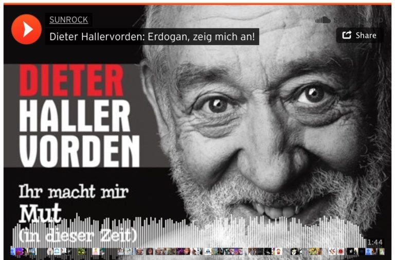 Jetzt also auch noch ein Erdogan-Song von Dieter Hallervorden (ja, der mit dem Palim-Palim). Meiner Meinung nach ist es musikalisch kein so großer Wurf, deswegen poste ich den auch hier und nicht drüben. Aber inhaltlich prima. Gerne sollen dem Möchtegern-Sultan noch ein paar weitere Songs und Witze um die Ohren gehauen werden, vielleicht kapiert der Mann dann irgendwann mal, dass in Deutschland Presse- und Satirefreiheit noch existieren.
