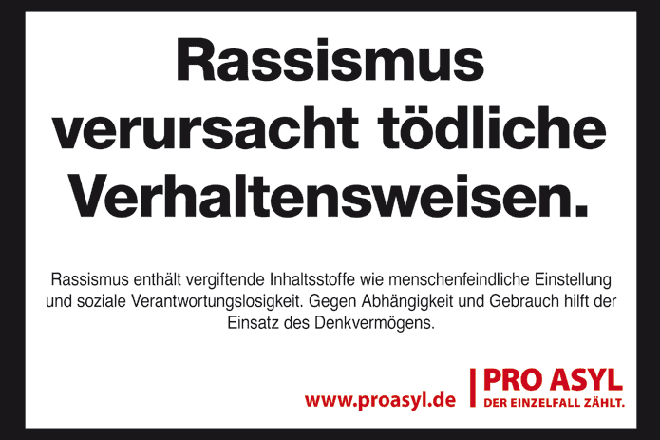Pro Asyl verteilt Aufkleber, die – an die Warnungen auf Zigarettenschachteln angelehnt – vor den Gefahren von Rassismus warnen. Eine durchaus amüsante Art und Weise seiner Meinung zu Rassismus Ausdruck zu verleihen. Mein letztes MacBook zierte auch so ein Aufkleber (mein aktuelles ist und bleibt erstmal aufkleberfrei). Man kann natürlich auch die Aufkleber nehmen, einen AfD-Flyer damit aufwerten und diesen Flyer dann an einen AfDer schicken. Ist eigentlich nicht lustig und auch nicht sonderlich kreativ.