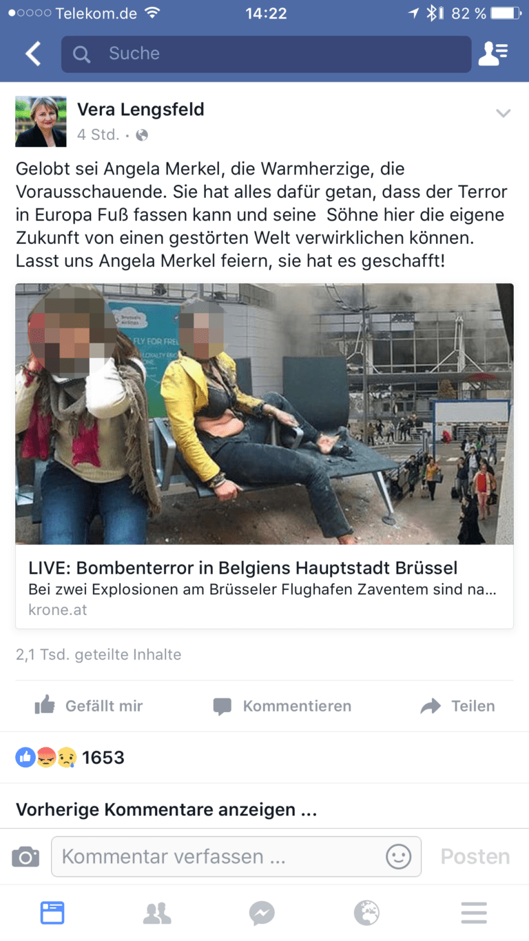 Wir erinnern uns: Direkt nach den Anschlägen von Brüssel erschien auf der Facebook-Seite von Vera Lengsfeld ein reichlich geschmackloser Beitrag. Dieser hatte das Zeug zum „Arschloch-Kommentar des Tages“ zu werden. Nun will das aber Frau Lengsfeld gar nicht gewesen sein. Und die Ausreden werden immer abenteuerlicher.