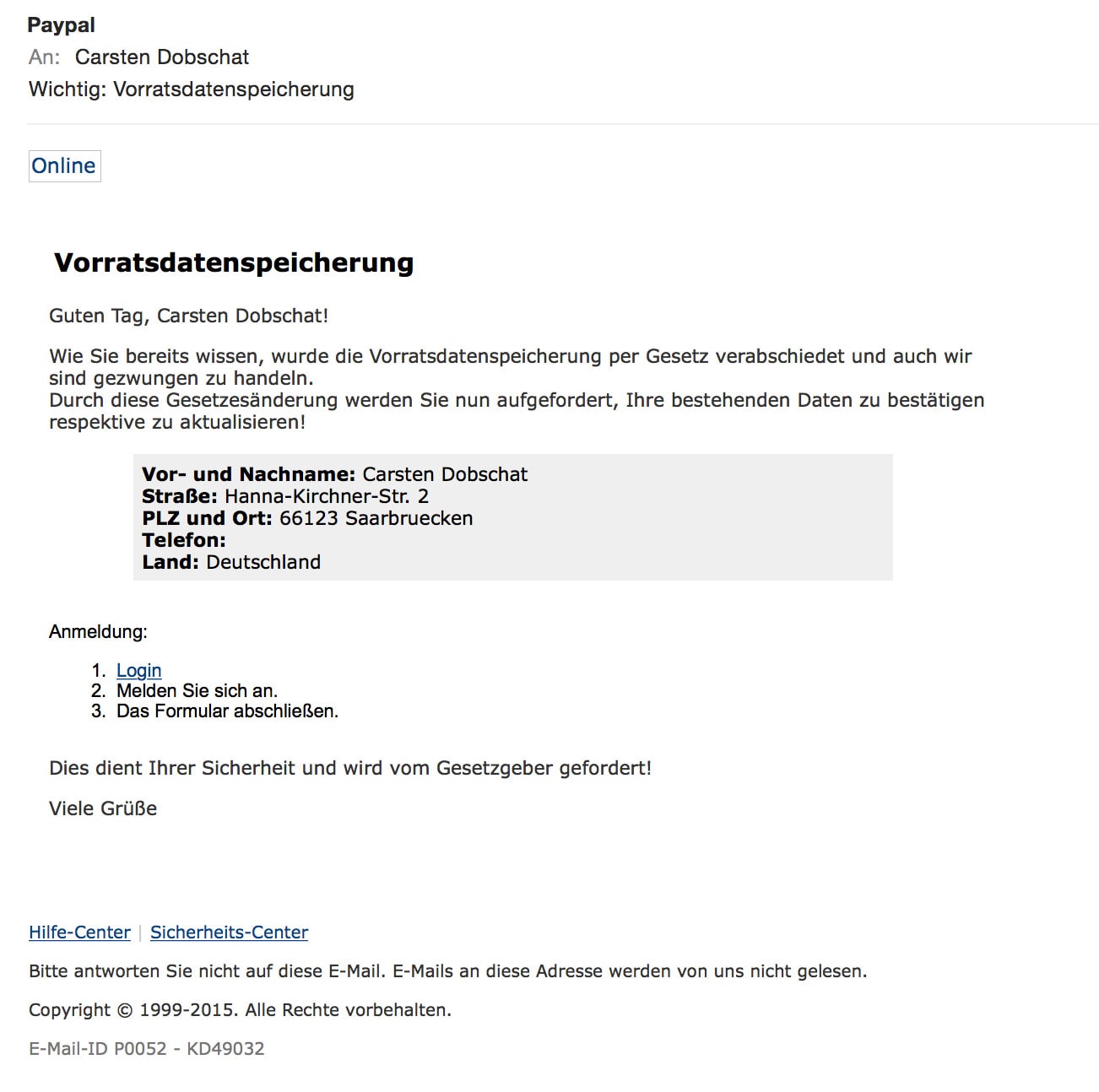 Ist die korrekte Stadt (bei falscher Straße) Zufall, oder haben die Phisher etwas genauer hingeguckt?