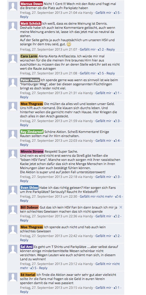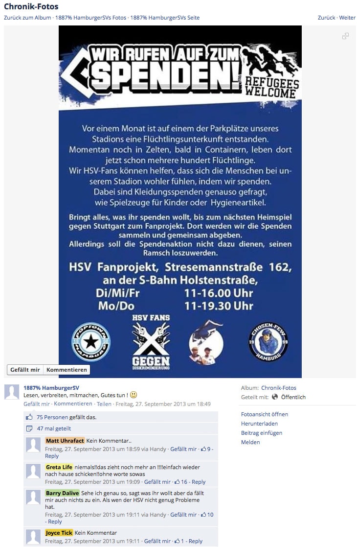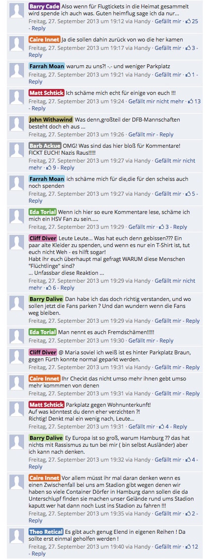 Es gibt Tage, da schaut man sich auf Facebook um und es wird einem nur noch schlecht. Bevorzugt immer dann, wenn sich Rassisten zusammen finden und ungeniert ihre menschenverachtenden und auch volksverhetzenden Parolen in irgendwelche Kommentarbereiche absondern. So geschehen gestern bei einer HSV-Fanseite. Es beginnt mit einem Aufruf für Flüchtlinge zu spenden, die in Zelten (später Containern) am Stadion untergebracht werden. Es geht hier um Flüchtlinge, Menschen, die selbst meist gar nichts mehr besitzen, die ihre Heimat, Freunde und Familie verlassen haben, weil sie dort Angst um ihr Leben hatten. Und es wird um Kleiderspenden gebeten, um Spielzeug für die Kinder, um Hygieneartikel.