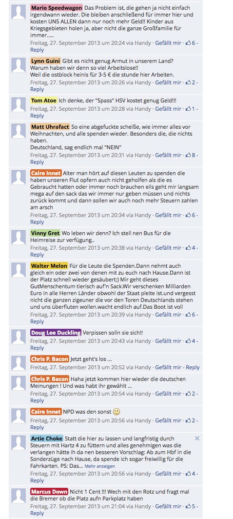 Die Reaktion sind teilweise an Menschenverachtung und Hass kaum noch zu überbieten. Man solle die Flüchtlinge wieder nach Hause schicken, das Boot sei voll, man würde höchstens für Rückflugtickets sammeln, die Flüchtlinge werden als „Rotz“ und „Scheisse“ bezeichnet. Die folgenden Screenshots wurden von SocialFixer anonymisiert: