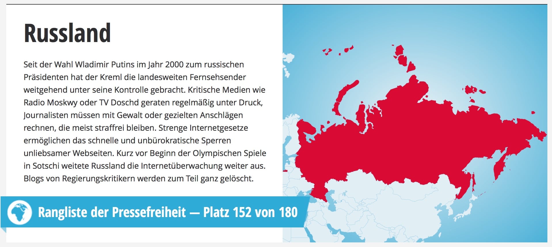 Damit könnte die Geschichte mehr oder weniger am Ende sein, wäre da nicht die russische Botschaft, die gerade die Rolle des Bocks einnimmt, der Gärtner sein will oder die eines Veganers, der eine Metzgerei eröffnet. Ausgerechnet aus der russischen Botschaft wird nun also die Strafanzeige kritisiert und behauptet, dass es sich dabei um einen Angriff auf die Pressefreiheit handeln würde. Russland? Pressefreiheit? Ach ja, das Russland, das laut im Pressefreiheitsranking der Reporter ohne Grenzen auf Platz 152 von 180 steht? Ist klar…