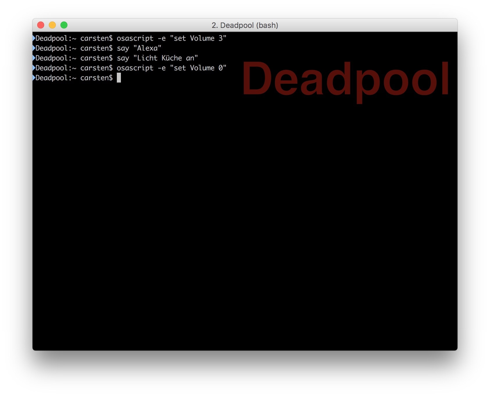 osascript -e "set volume 3" say "Alexa" say "Licht Küche aus" osascript -e "set Volume 0"