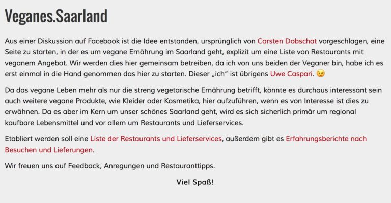 Ich bin zwar immer noch Allesfresser und esse gerne gutes Fleisch, aber warum nicht auch mal gezielt vegan essen und darüber schreiben? Es war zwar nur so eine Idee in einer Diskussion bei Facebook, die mit „Also wenn ich mich für veganer Essen interessieren würde…“ begann und mit der Registrierung der Domain „veganes.saarland“ endete, aber so was passiert ja hin und wieder ;)