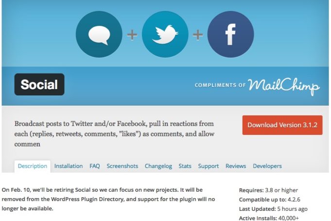 Social ist ein wirklich nettes WordPress-PlugIn: Es dient(e) dazu neue Beiträge auf Twitter und Facebook zu verbreiten und hat dann nebenbei noch die Reaktionen von diesen Plattformen eingesammelt und als Reaktion ins Weblog geholt. Praktische Sache, um Diskussionen zu einem Beitrag eben auch bei diesem Beitrag im Blog zu haben. Damit ist nun am 10. Februar Schluß – nicht schön.