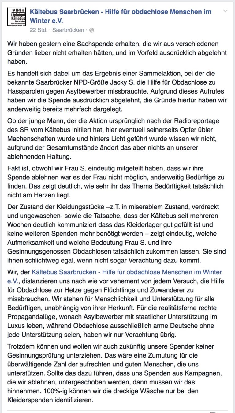 Na weil es gerade so „schön“ ist… Jeder dürfte schon mal das Standardargument vom rechten Rand gehört haben: „Milliarden für die Flüchtlinge, aber für unsere armen doitschen Obdachlosen ist kein Geld da“. Natürlich ist das kein Argument, sondern gewaltiger Bullshit mit dem vom rechten Rand aus versucht wird Bedürfte gegen andere Bedürfte auszuspielen. Und ich will mich jetzt auch nicht lange mit der Frage aufhalten, ob unser Staat etwas, genug oder zu wenig für Obdachlose tut. Auch wer ich nicht die Frage behandeln, ob man in Deutschland wirklich auf der Straße leben muss oder ob es nicht doch auch anders geht. Nein, wir werfen nur mal einen Blick darauf, was passiert, wenn die NPD mal etwas für die Obdachlosen tut oder zu tun vorgibt.