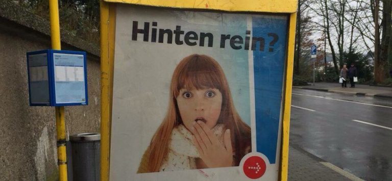 Jetzt weiß ich wenigstens, dass man in Wuppertal bislang die „Im Bus vorne beim Fahrer einsteigen und die Fahrkarte zeigen“-Regel noch nicht kannte. Und ich kann mir vorstellen, dass in irgendeiner Agentur ein paar Kreative seit der Abnahme dieses Motivs durch den Kunden lachend über ihre Schreibtische kullern – ich zumindest wäre gerade fast vor Lachen von meinem Schreibtischstuhl gefallen :D