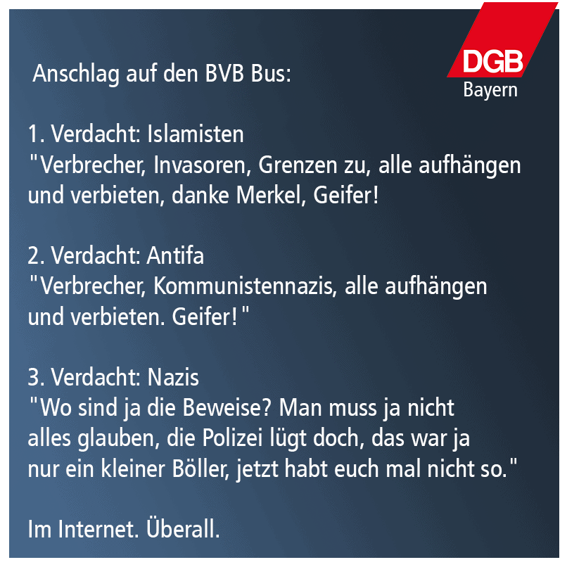 Statt vorsichtig vorzugehen, nicht anzufangen irgendwelche Pauschalverurteilungen durch die Gegend zu posaunen, reagieren die je nach verdächtigtem Täterkreis unterschiedlich. Auch eine Art der Differenzierung, wenn auch eine verdammt blöde Art. Der DGB Bayern hat das mal schön zusammengefasst: