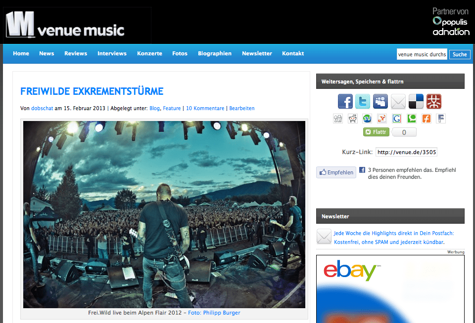 Eigentlich wollte ich zu dem ganzen Thema erst gar nichts schreiben, dann habe ich doch was geschrieben und war mir nicht so ganz sicher, wo ich es abladen soll: Hier oder drüben bei venue music. Habe mich dann für venue music entschieden und werfe hier einfach nur den Hinweis rein. Muss einem nicht gefallen, was ich da geschrieben habe, mir gefällt auch so einiges nicht, diskutiere auch gerne darüber. Aber bitte sachlich! Der erste, der wieder meint laut aufschreien zu müssen, weil ich angeblich alle Frei.Wild Fans als Nazis bezeichnen würde (was ich nicht tue), der bekommt von mir ein vergoldetes Stück Scheisse – und das meine ich wörtlich…